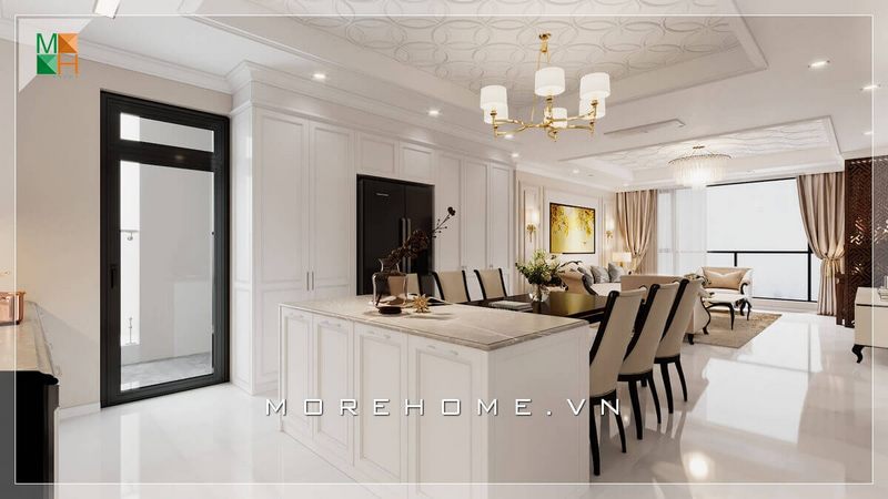 Mẫu đảo bếp tân cổ điển mặt ốp đá cao cấp sang trọng, phù hợp cho không gian thiết kế chung của ngôi nhà mang phong cách tân cổ điển.