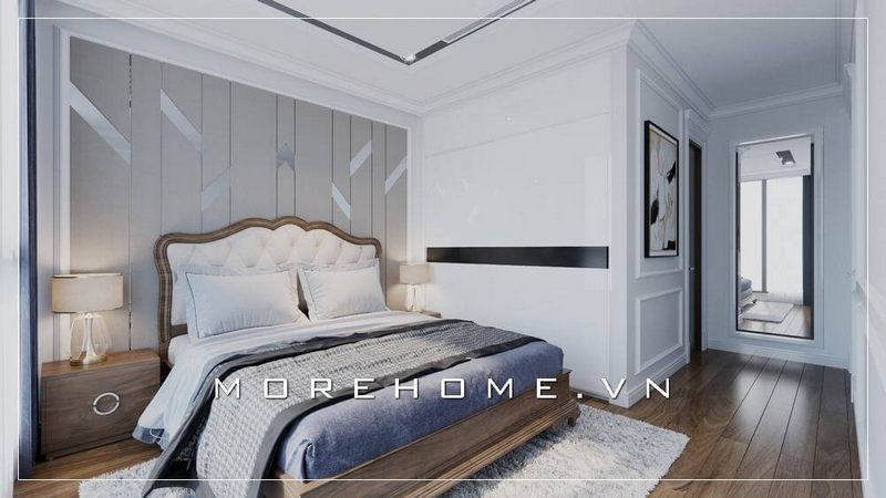 Giường ngủ gỗ công nghiệp bọc nỉ toàn bộ được bố trí ở chính giữa tạo sự cân bằng tổng thể không gian căn phòng