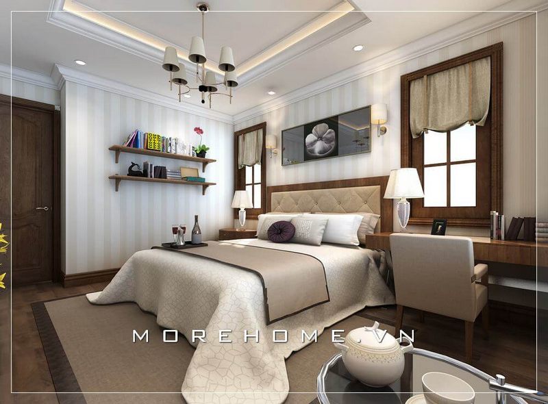 Mẫu thiết kế phòng ngủ chung cư nhỏ sang trọng và đẳng cấp với chiếc giường ngủ óc chó bọc da đầu giường phong cách tân cổ điển