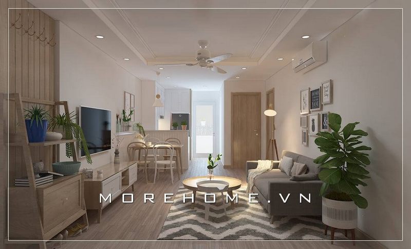 Sofa văng và thảm trải sàn được sử dụng để bố trí nội thất phòng khách hiện đại và ấn tượng trong căn hộ chung cư.