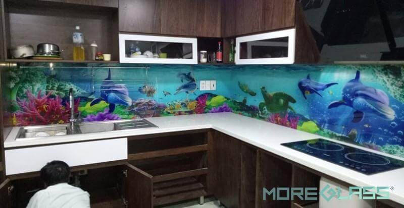 Mẫu thiết kế kính ốp bếp hoa văn họa tiết Mosaic, phù hợp với những không gian đơn giản, thanh lịch, khiến cho căn bếp của bạn trông rực rỡ sống động hơn
